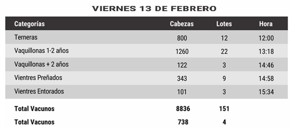 A partir de las 12.00 horas se venderán: 800 terneras, 1.260 vaquillonas de 1 a 2 años, 122 vaquillonas de más de 2 años, 343 vientres preñados y 101 vientres entorados.