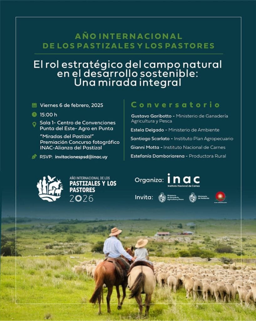 También el viernes 6 de febrero, a las 15.00 horas, con la organización de INAC, será el conversatorio Año Internacional de los Pastizales y los Pastores, con la participación de Gianni Mota de gerencia de Sostenibilidad.
