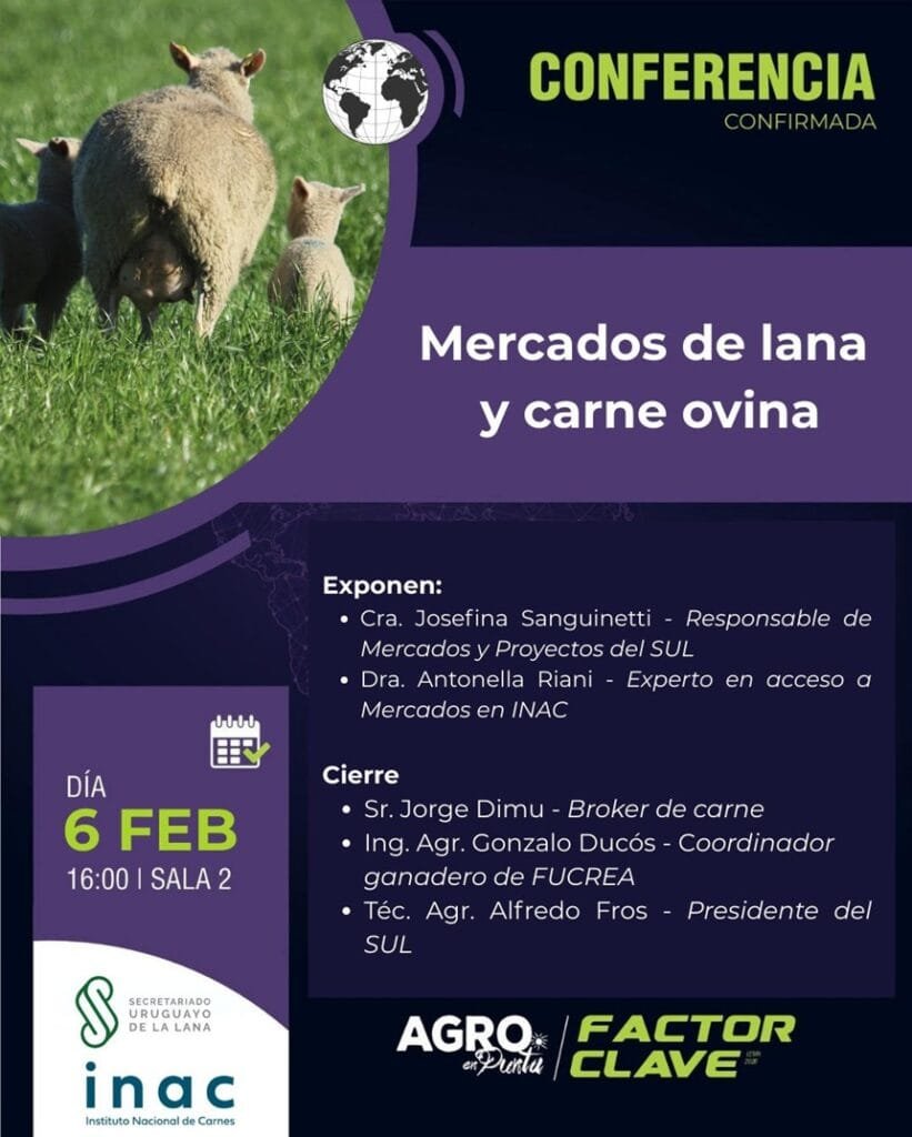 La tercera actividad también será el viernes 6 de febrero, a las 16.00 horas, en la sala 2, con la organización del Secretariado Uruguayo de la Lana (SUL). Participa Antonella Riani de Acceso a Mercados.