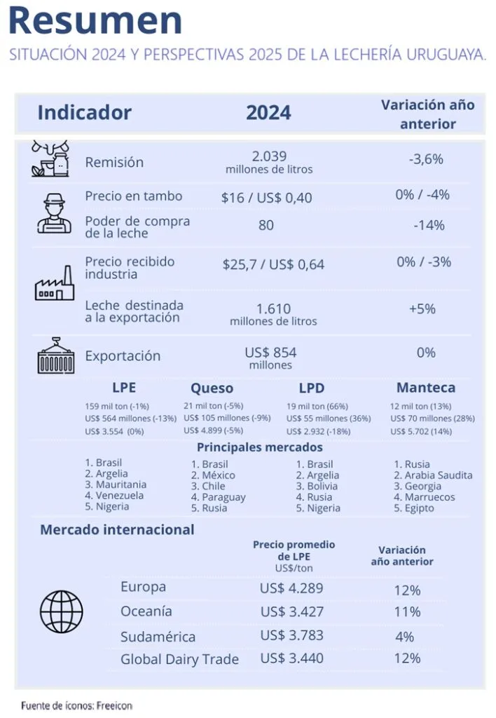 En la síntesis del texto, Inale recuerda que 2024 “fue desafiante debido al exceso hídrico de otoño, época de pariciones, ensilado y siembra de pasturas”, lo que “repercutió en la remisión que se ubicó en 2.039 millones de litros”, una caída del 3,6% en comparación con 2023.
