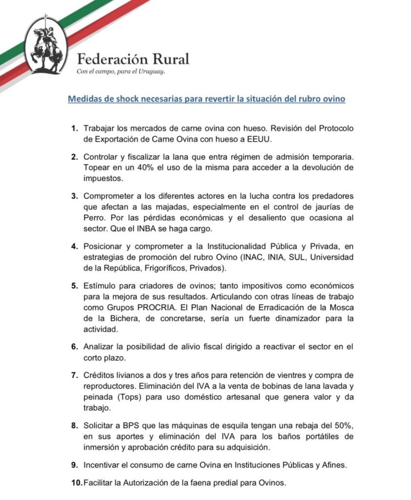 En el primer punto la Federación Rural pide que se realice una “revisión del Protocolo de Exportación de Carne Ovina con hueso a Estados Unidos”.