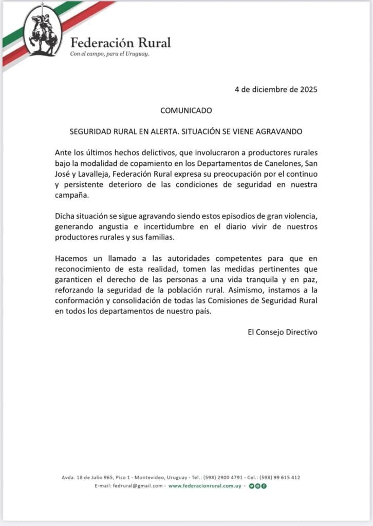 La Federación Rural centró su atención en los hechos delictivos que involucran a productores rurales: “Ante los últimos hechos delictivos, que involucran a productores rurales bajo la modalidad de copamiento en los departamentos de Canelones, San José y Lavalleja” es que la institución expresó “preocupación por el continuo y persistente deterioro de las condiciones de seguridad en nuestra campaña”.