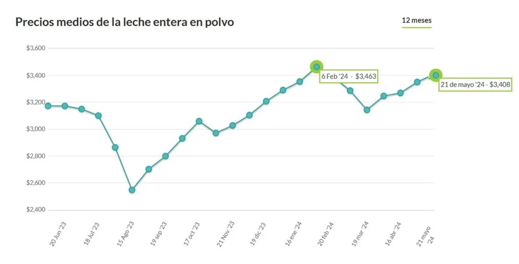 La leche en polvo entera volvió a subir (+2,9%) a US$ 3.408 la tonelada. El valor más alto desde el 6 de febrero pasado (US$ 3.464).