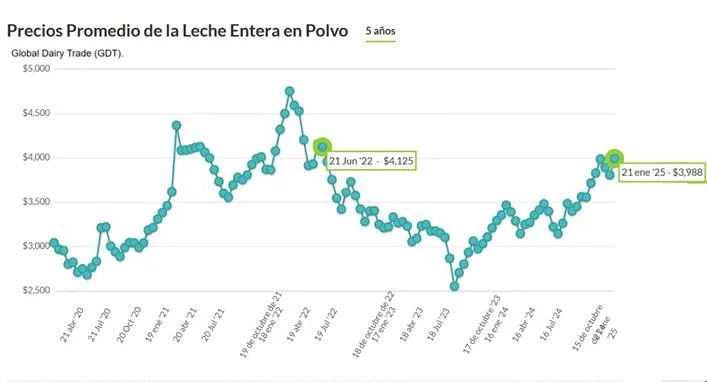 En junio de 2022 la tonelada de leche en polvo entera cotizó a US$ 4.125, ayer alcanzó el segundo valor desde entonces, US$ 3.988.