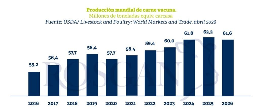 A nivel global, se espera que en 2026 la producción de carne vacuna disminuya un 1%, hasta alcanzar 61,6 millones de toneladas, lo que implica un recorte de 685.000 toneladas respecto de 2025, frente a las 913.000 toneladas proyectadas seis meses. Se trata de la primera caída en producción, tras cinco años de crecimiento ininterrumpido.