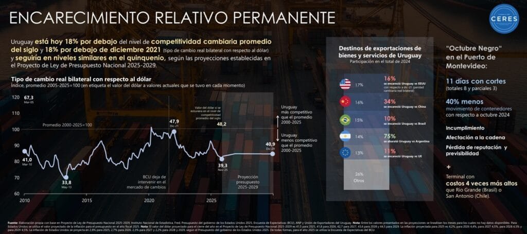 El estancamiento económico de Uruguay tiene muchos factores: el contexto internacional que puede jugar a favor o en contra, según sople el viento; también hay factores internos y uno muy claro es el encarecimiento relativo del país, porque estamos 18% por debajo del tipo de cambio real de lo que tuvo en promedio de lo que va del siglo (los últimos 25 años). El dólar afecta al sector exportador, agregó Munyo, aunque aclaró que no es el único componente de la competitividad del país, pero es relevante cuando no se hacer reformas que afecten positivamente la competitividad.
