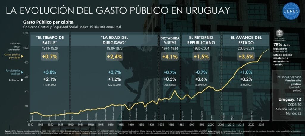 Uruguay tiene un funcionario público cada 12 personas, cuando en países avanzados hay uno por cada 20 personas, y hay casos en que atiende a 32. “El de Uruguay es de los niveles más intensos de funcionarios públicos por persona y eso genera una mochila pesada para el sector productivo, porque hay que pagarlo, y en promedio los salarios públicos son 50% más altos que los del sector privado”.