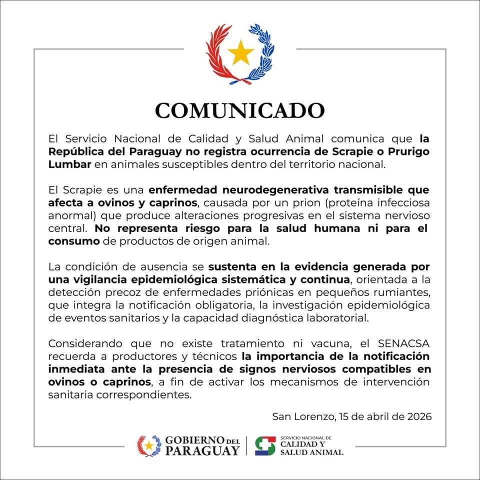 En la tarde de ayer el Senacsa emitió un comunicado en el que expresa que Paraguay “no registra ocurrencia de scrapie o prurigo lumbar en animales susceptibles”.