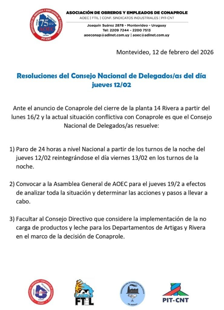 Y tercero, la Directiva de AOEC fue facultada para que considere no cargar productos y leche en Artigas y Rivera.