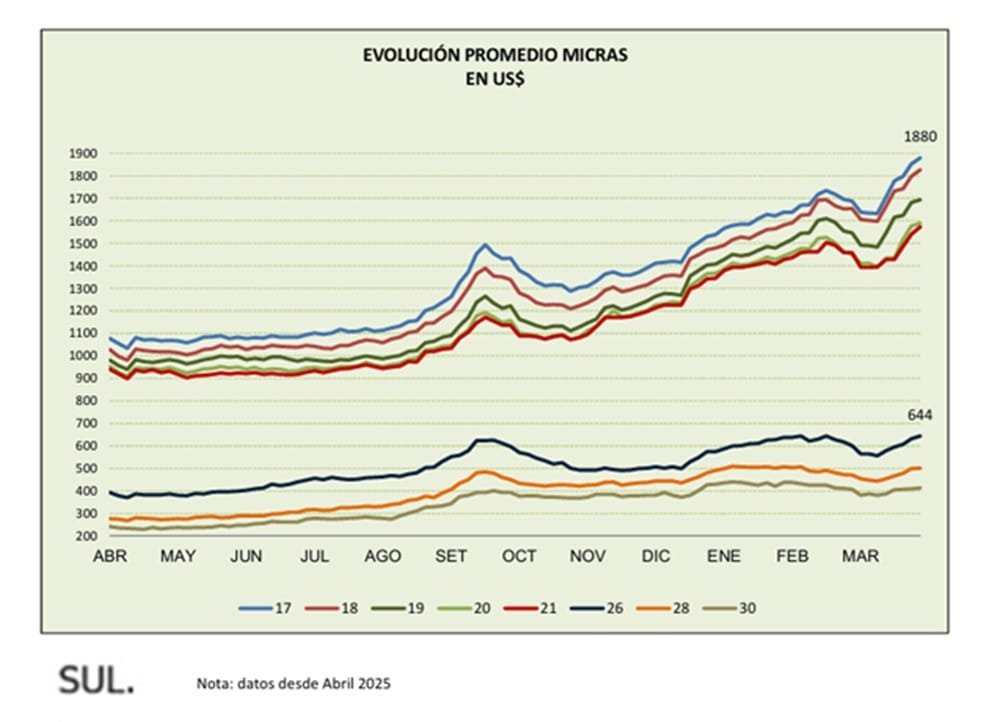 El miércoles 1° de abril la suba fue de 3,3% colocando el valor promedio en US$ 12,34 el kilo base limpia. Ese día la colocación de la oferta fue prácticamente total.