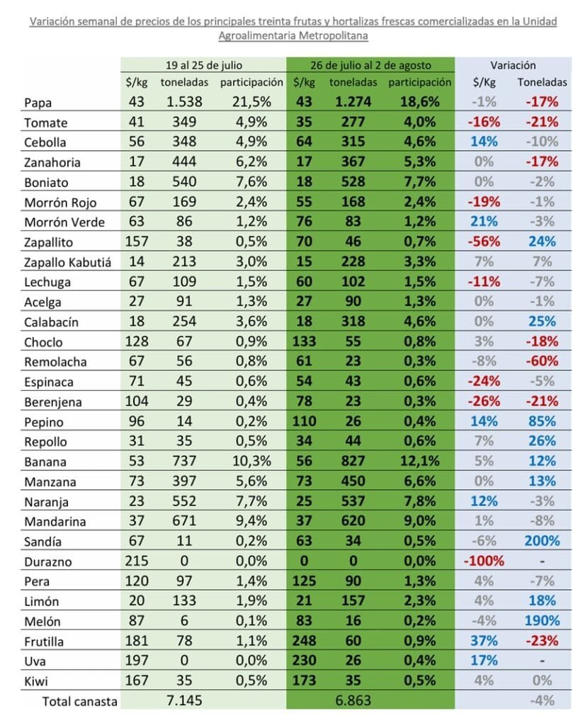 En papa y zanahoria, la oferta comenzó a incrementarse con el ingreso de partidas de reciente cosecha, correspondientes a cultivos de invierno que presentan mejores características de conservación. Esta mejora en la calidad, particularmente en la vida poscosecha, ha generado presiones a la baja en sus precios.
