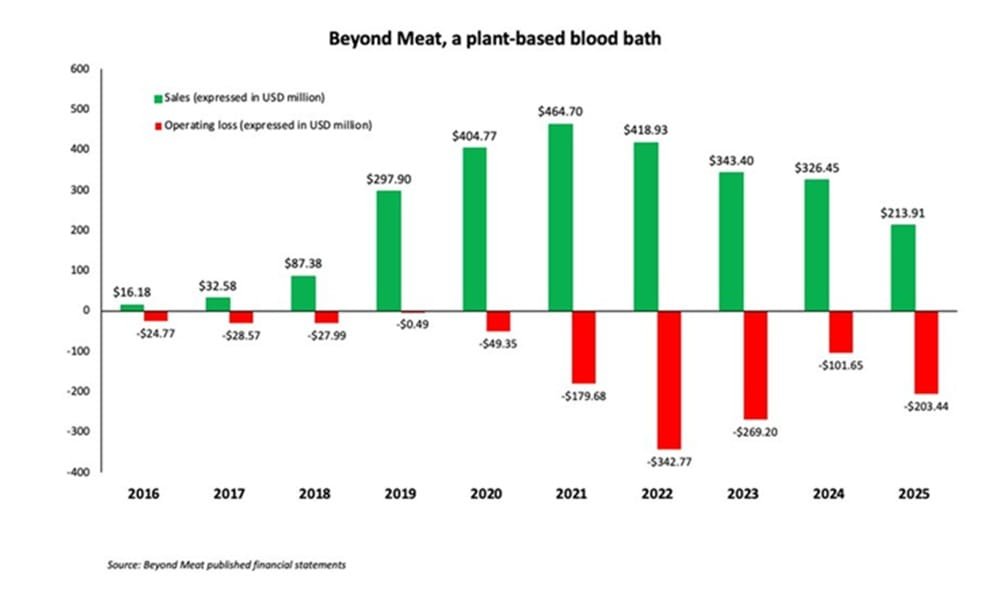 Beyond Meat just released its 2025 results. 1. It has never made a profit. 2. Each $1 of product it sold in 2025 cost it $1.95 to make. 3. That’s a dramatic change since 2024, when each $1 of product it sold cost $1.32 to make. 4. It has $1.2 billion of accumulated losses on its… pic.twitter.com/64q8RnYATv