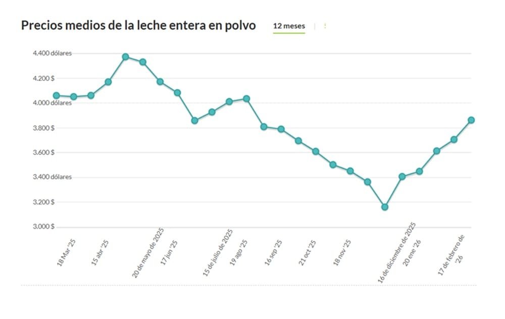 Cabe destacar que la leche en polvo entera subió por quinta vez consecutiva, recuperando el valor que perdió en los últimos eventos de 2025.