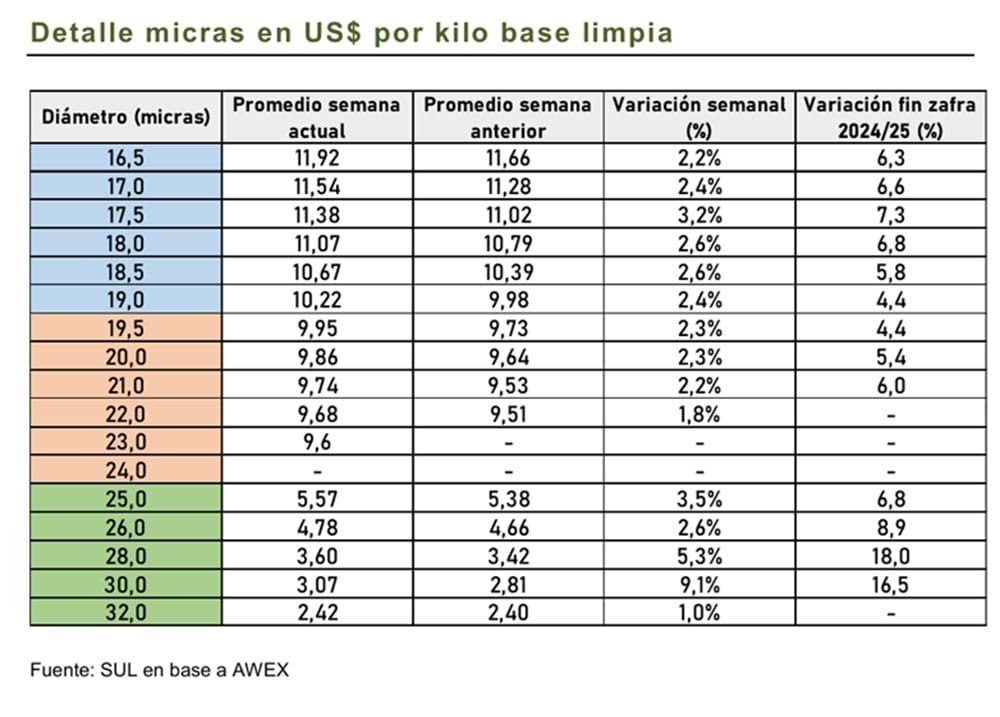 Las mayores subidas de precio de la semana provinieron del sector vellón Merino de 17 micras. Informe del Secretariado Uruguayo de la Lana.