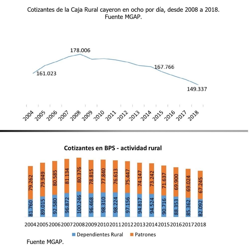 En 2020, en el marco de discusión del presupuesto nacional, el entonces ministro de Ganadería, Agricultura y Pesca, Ing. Agr. Carlos Uriarte, dijo en la Cámara de Diputados, que la cantidad de cotizantes del sector rural (a la Caja Rural) cayó de forma notoria: en 2028 había 178.006 que en 2018 pasaron a ser 149.337. La diferencia es de 28.669, lo que implica “una baja de ocho cotizantes por día en el sector rural”.
