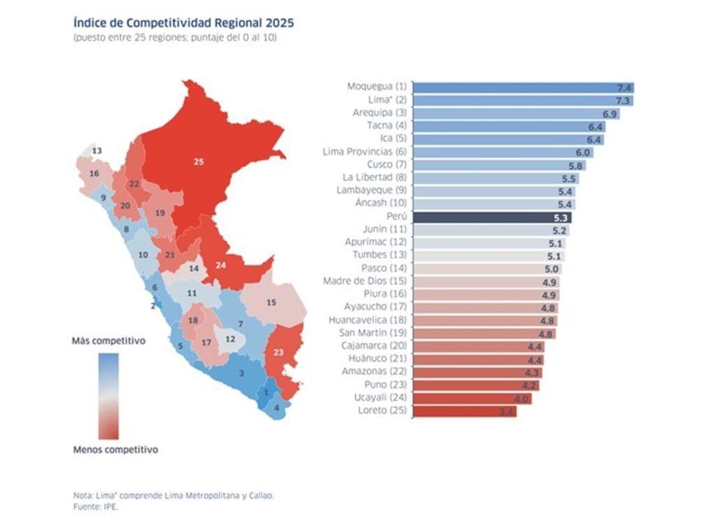 Otro problema es la desigualdad regional, con la capital, Lima, concentrando gran parte del crecimiento, mientras que zonas rurales y amazónicas enfrentan rezagos en servicios básicos y productividad. En 2025, el Índice de Competitividad Regional (Incore), elaborado por el Instituto Peruano de Economía (IPE), indicó que Lima, Moquegua y Tacna lideran con economías robustas y sistemas de salud y educación avanzados, pero regiones como Madre de Dios y Apurímac (al sur) enfrentan informalidad, conflictos sociales y rezagos estructurales.